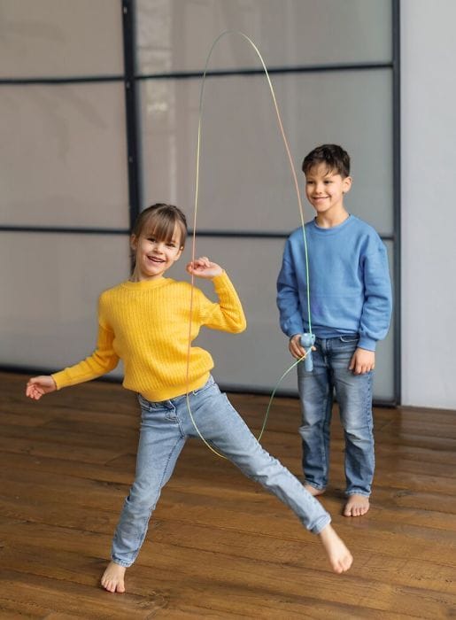 Een druk op de knop is voldoende om het touw in beweging te zetten. De touwwerper laat een magisch touw door de lucht wervelen, waardoor de meest verbazingwekkende vormen ontstaan – erdoorheen springen is bijzonder leuk!