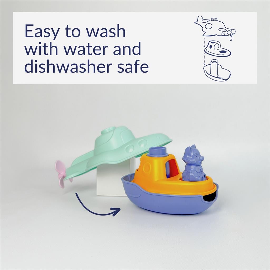Een vrolijke onderzeeër die kan worden omgebouwd tot een boot voor verkenning. Dit voertuig bestaat uit drie in elkaar passende rompen. Dit volledig wasbare speelgoed kan in bad, binnen en buiten worden gebruikt en is bestand tegen alles. De onderzeeër is een educatief speelgoed dat de fantasie en behendigheid van peuters ontwikkelt.