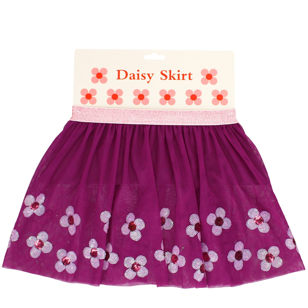 Een sprookjesachtige rok voor kinderen, in paars, versierd met bloemen en glitters op de tailleband. Ideaal voor verkleedpartijen of rollenspellen. Of gewoon om aan te doen naar een feestje.