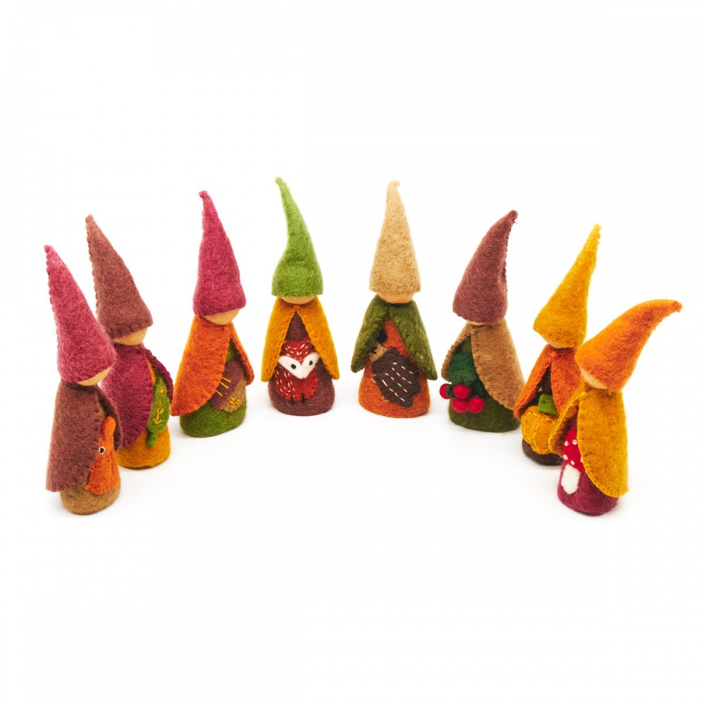Vilten bospoppetje in aardetinten met op hun buikje een afbeelding van hulst, paddenstoel, pompoen, eikeltje, egeltje, eekhoorn, vos of een herfstblad. Erg populair vanwege de gezichtjes en de kleuren. Leuk op de herfsttafel en in de kinderkamer!