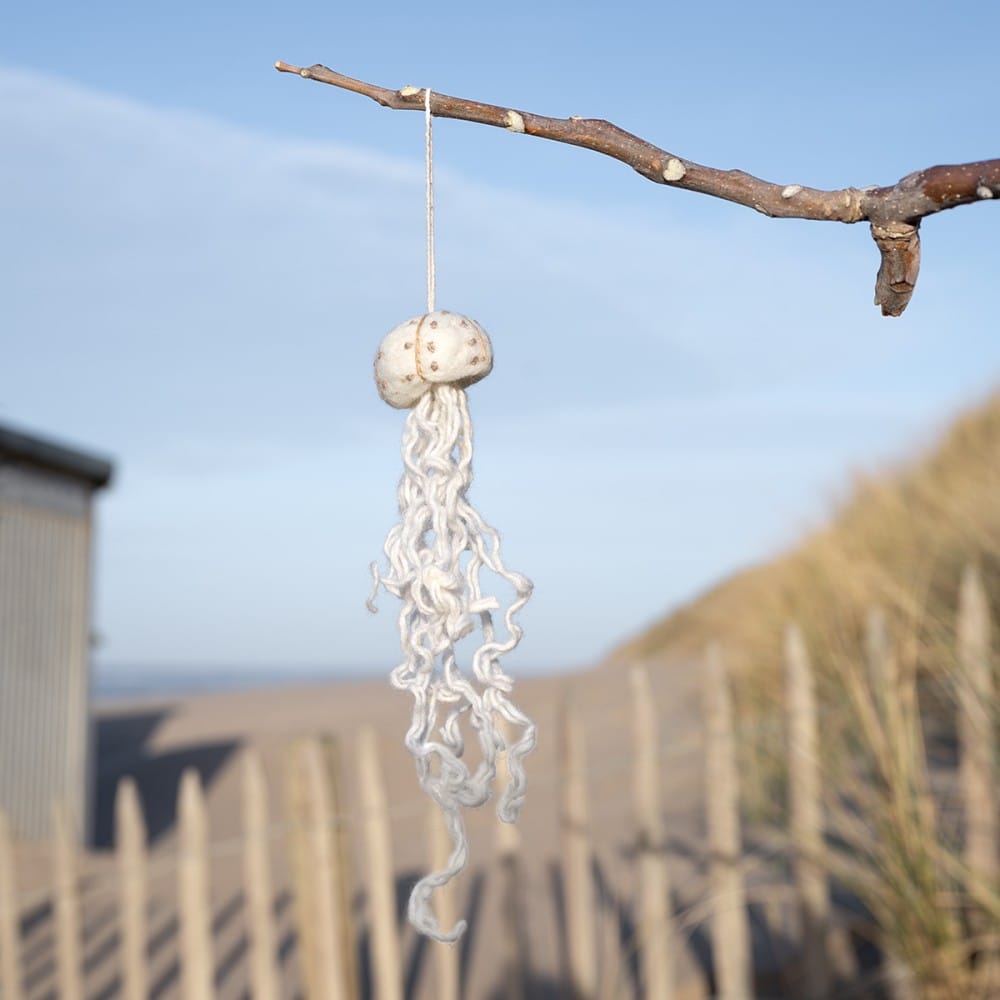 Prachtige vilten hanger van een kwal. Voorzien van touwtje om ergens aan te hangen. Leuk in bijvoorbeeld de kinderkamer of op de zomer seizoentafel.