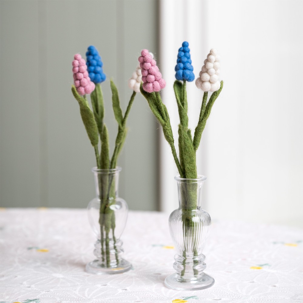 Prachtig blauw druifje van het delicate merino-wolvilt. In de stengel is metaaldraad verwerkt zodat de bloem in vorm gebogen kan worden indien gewenst. Erg leuk samen in een vaasje.
