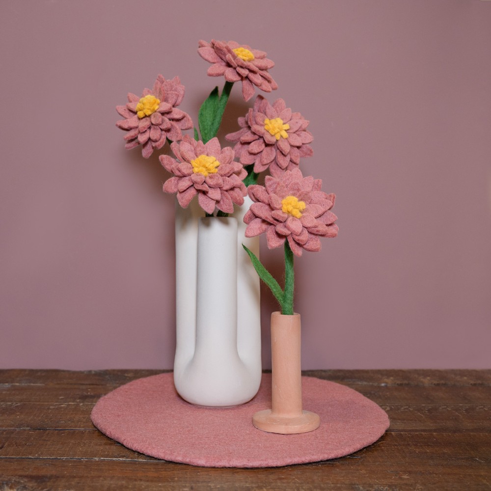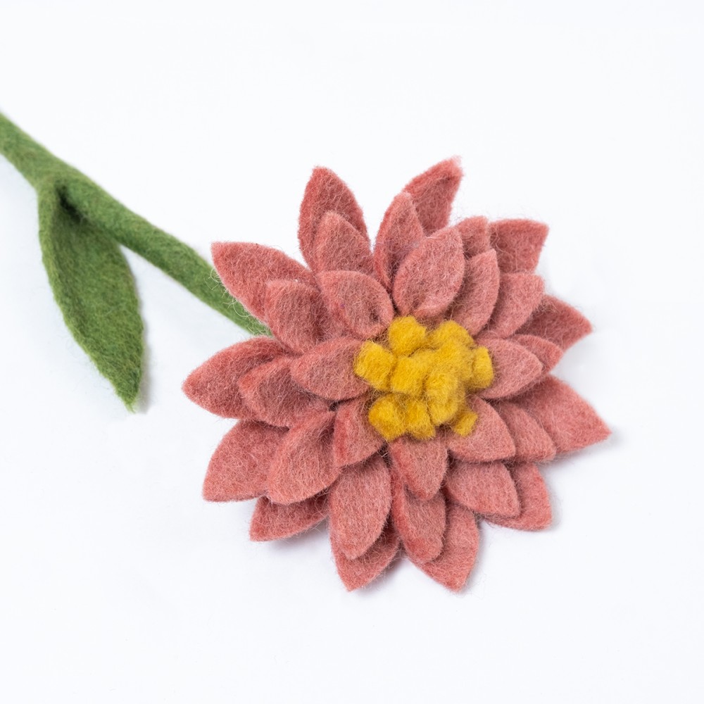 Prachtige Dahlia van vilt. Ideaal als bosje bloemen dat voor altijd blijft bestaan. In de stengel is metaaldraad verwerkt zodat de bloem in vorm gebogen kan worden indien gewenst.