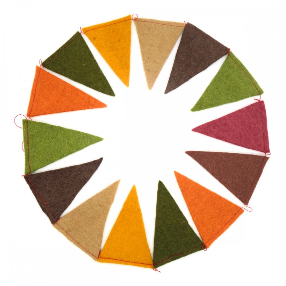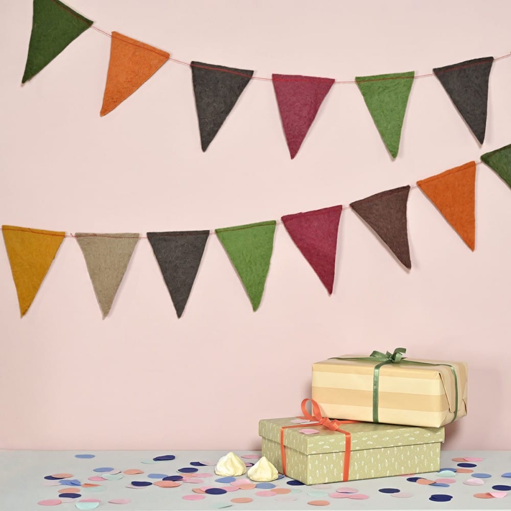 Kant en klare slinger met vilten vlaggetjes in aarde tinten. Heel leuk voor een verjaardag, bij de herfsttafel, maar ook als decoratie in elk interieur!