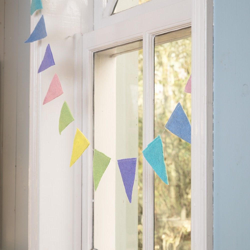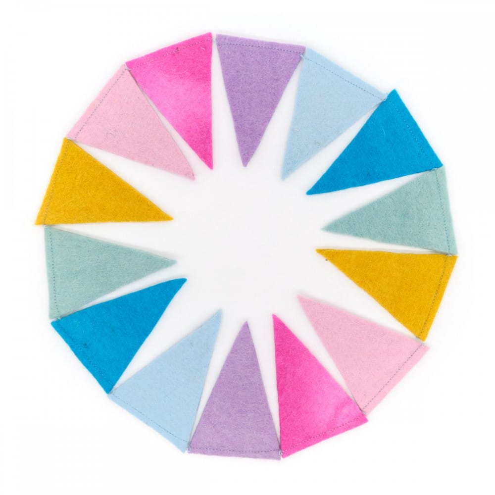 Kant en klare slinger met vilten vlaggetjes in pastel tinten. Heel leuk voor een verjaardag maar ook als decoratie in elk interieur!