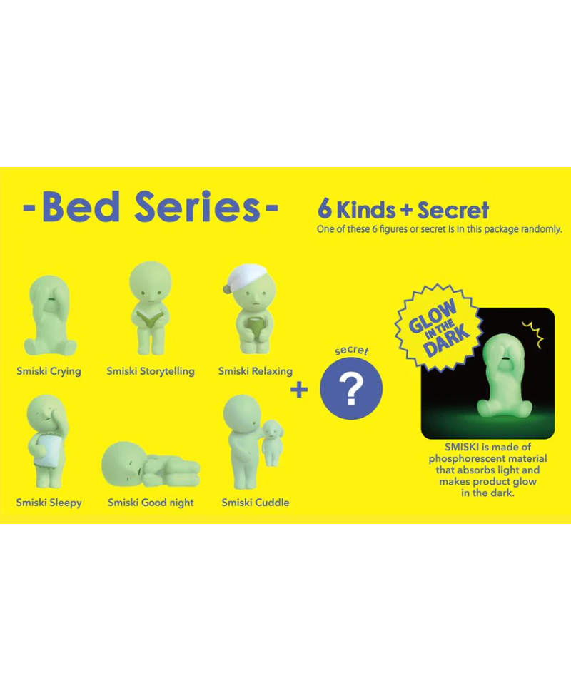 Smiski’s zijn gemaakt van fosforescerend materiaal dat licht absorbeert en het figuurtje doet oplichten in het donker. Ze worden verkocht in een “blind box”: het figuurtje zit willekeurig verpakt in een blind, gesloten doosje. Je weet dus nooit op voorhand welk figuurtje je uit de serie krijgt.