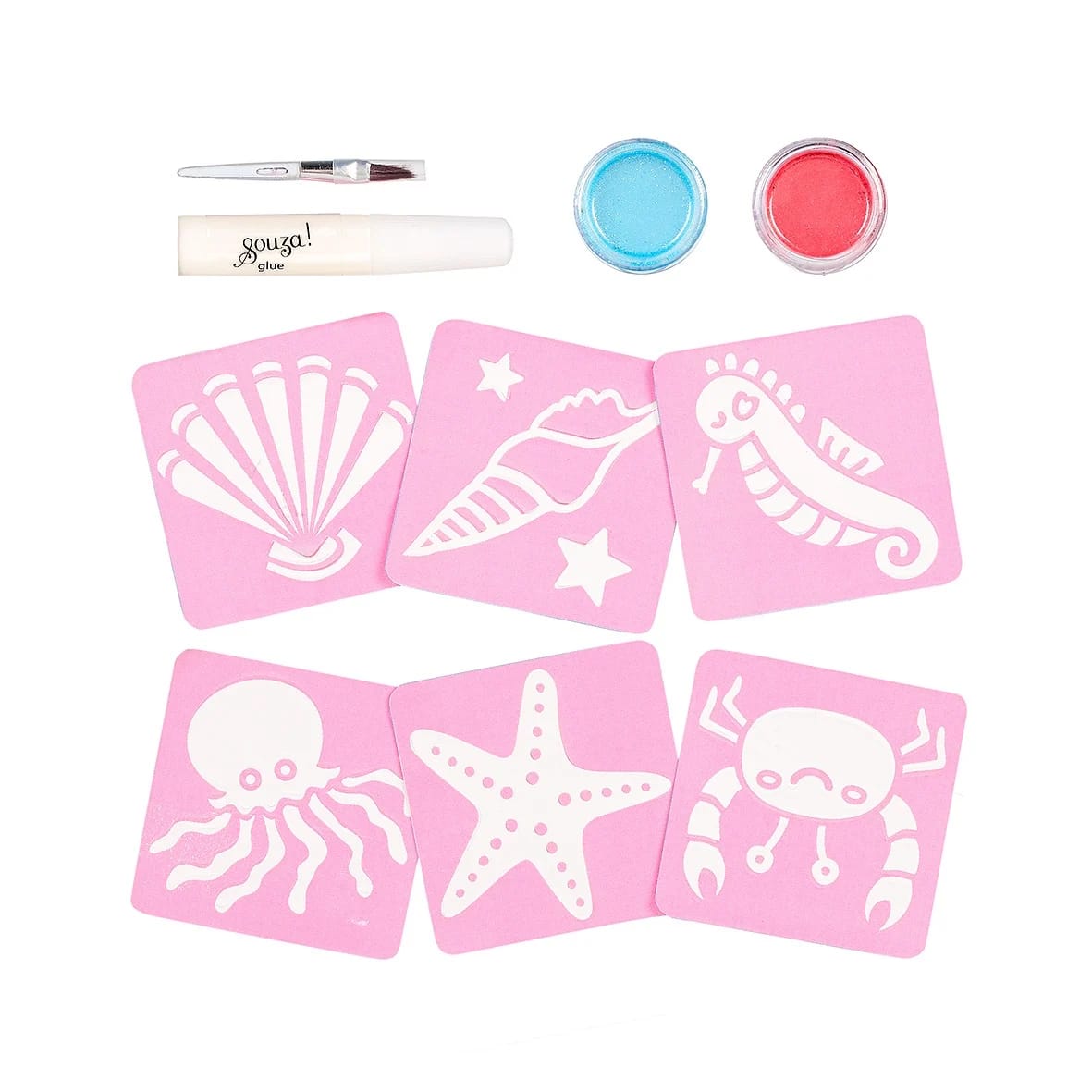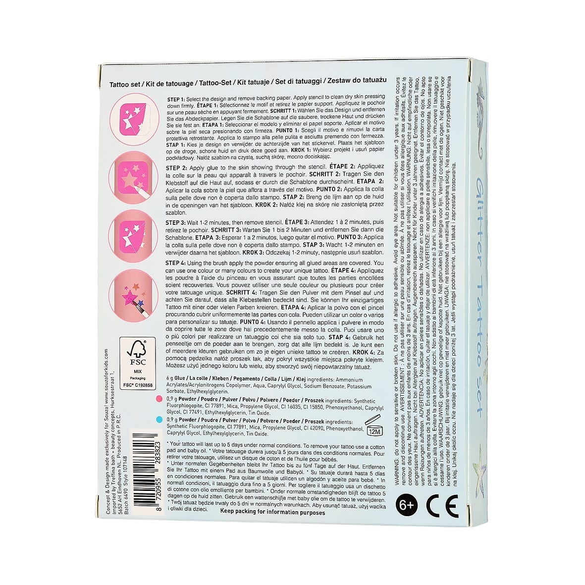 Maak zelf je eigen glitter tattoos met deze handige tattoo set! Met 2 verschillende glitterkleuren en 6 originele tattoo stencils.