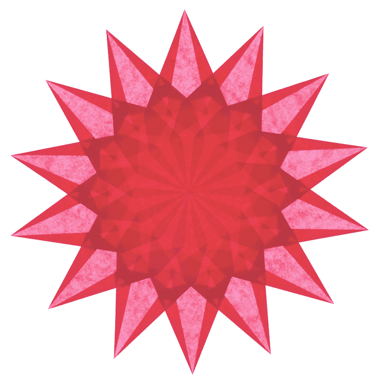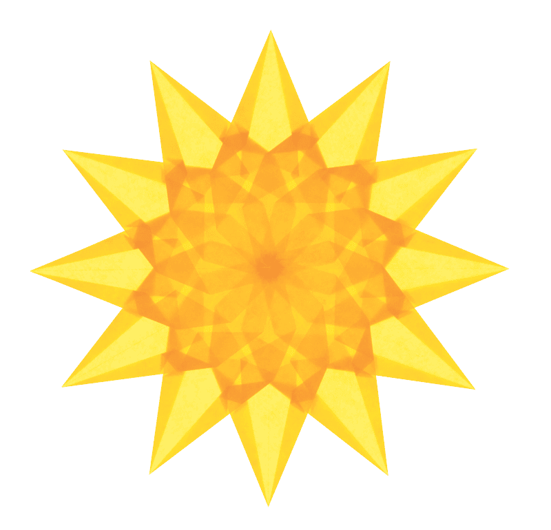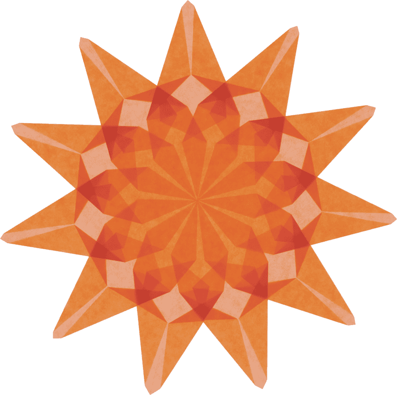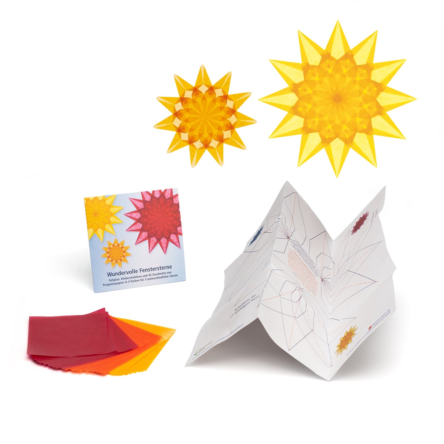 Geel, rood en oranje vliegerpapier, duidelijk vouwplan en zelfklevende stencils in originele grootte voor het plaatsen, hervouwen en verbinden van 3 raamsterren met 11, 12 of 14 balken.